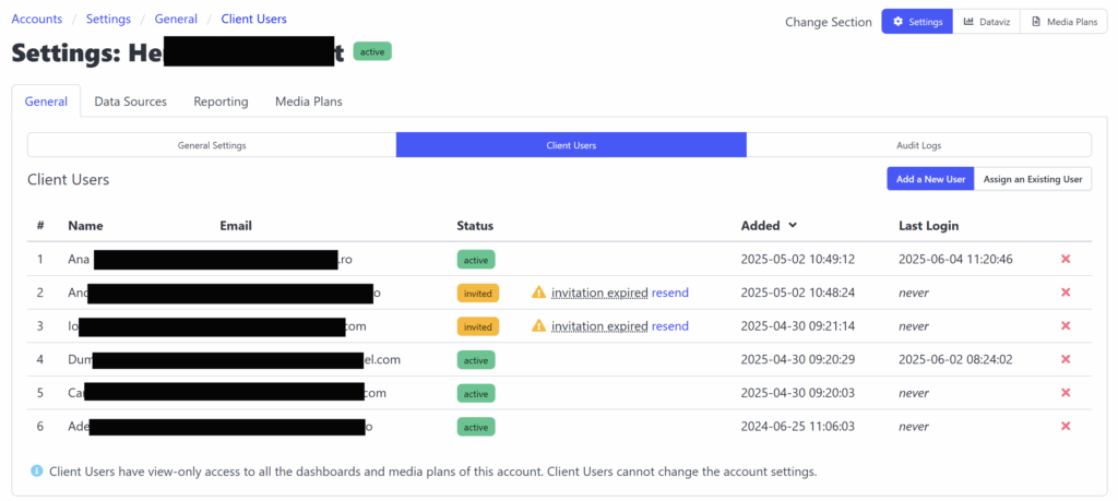 Client users have an all or nothing access. This means that a client user will access all your dashboards and media plans under a given account. You cannot restrict access to a specific dashboard or media plan for a client user.